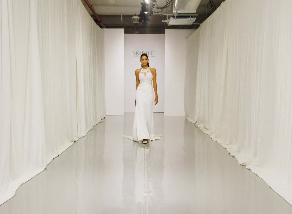 Sleek and sultry, the Alex 6933 Mori Lee wedding dress features a sheer Venice lace over a Chantilly lace bodice and a form-fitting slim crêpe skirt. The stylish high halter neckline leads the way to a breathtaking open keyhole back. An intricate cutaway petal train completes the look.