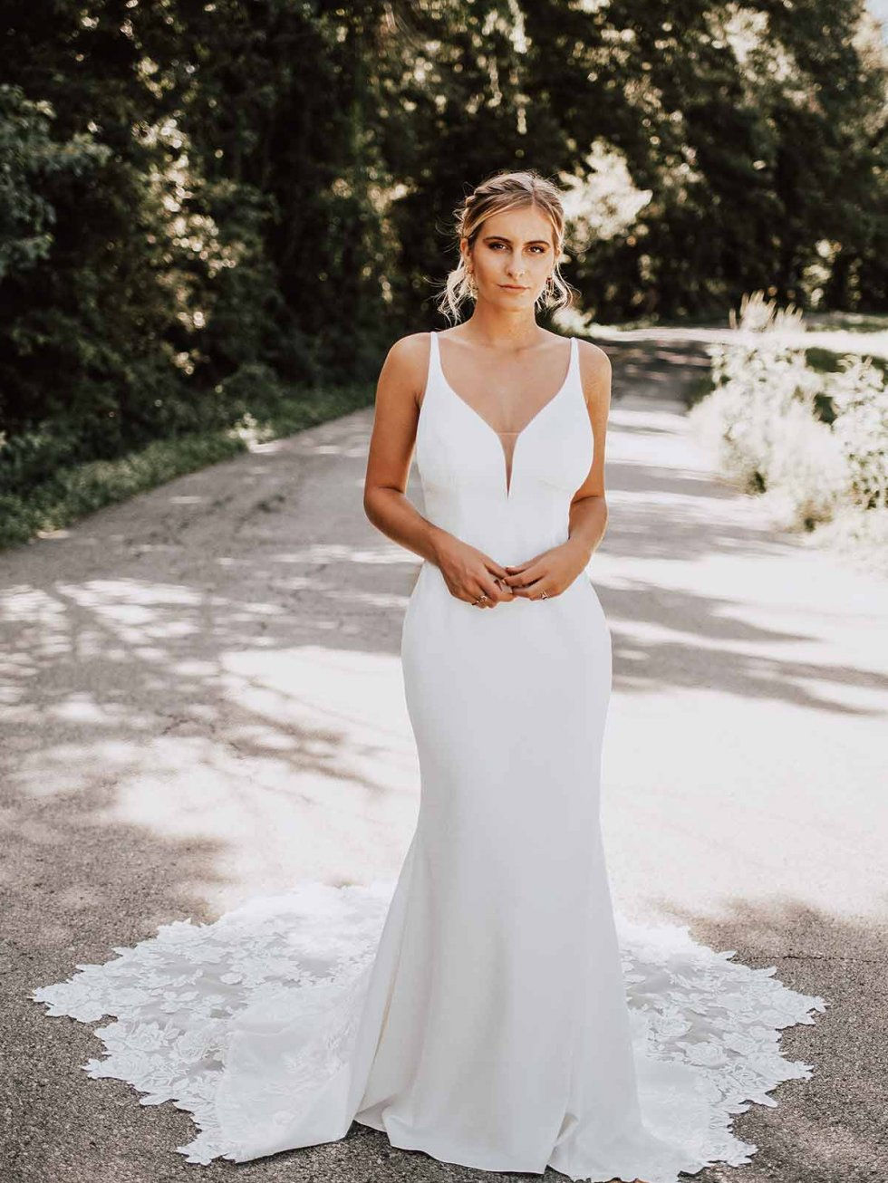 Where chic simplicity meets an organic masterpiece, Style D3112 from Essense of Australia is a stunner. The ultra-luxe, sleek stretch crepe fabric is seamless and sultry as it effortlessly hugs the figure in this sheath silhouette. The plunging V-neckline is the perfect parallel to the chic open back with a tapered floating strap detail. The chevron beading makes the straps pop with glamour, while the fabric-covered buttons along the back of the gown flow into the artful, organic masterpiece that is the sheer floral train.