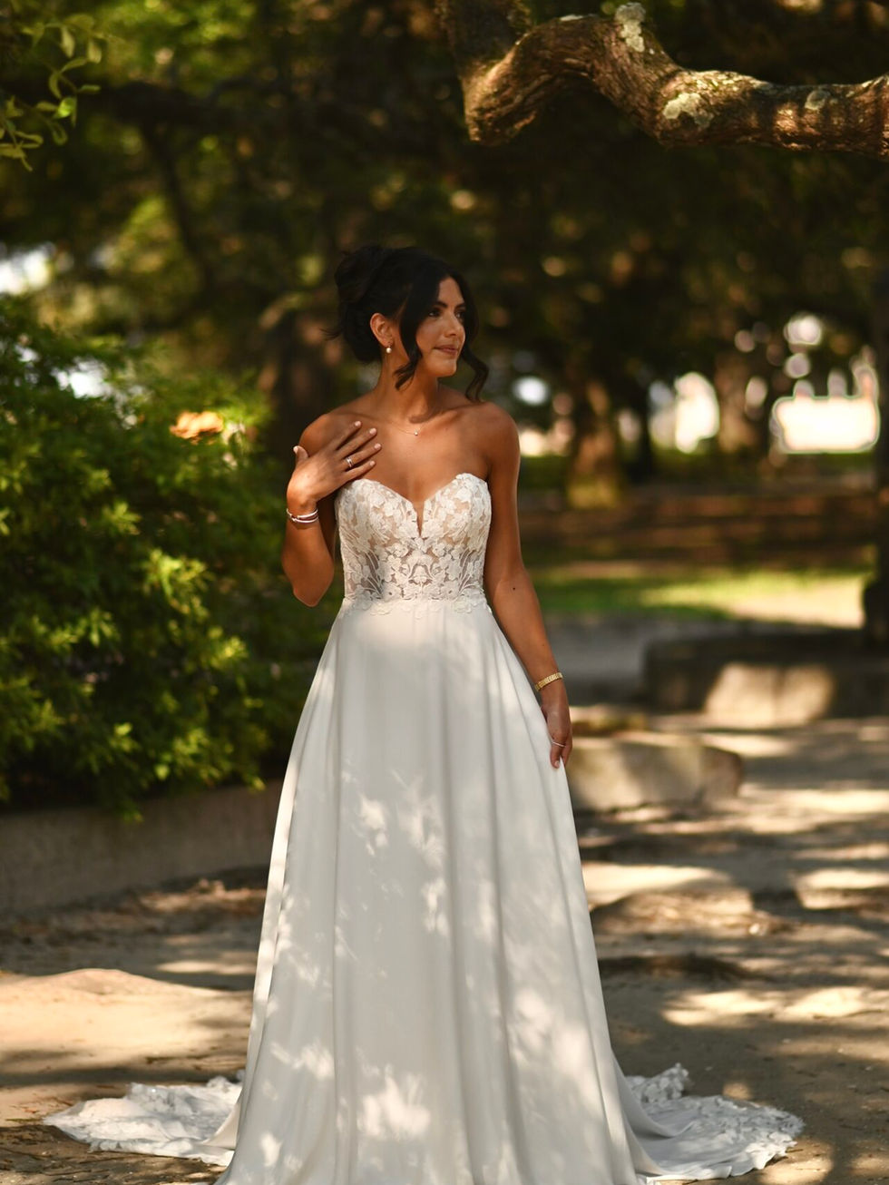 Glamorous lace and crêpe chiffon form an unforgettable soft A-line silhouette on Style D3862 from Essense of Australia. The strapless sweetheart neckline bodice is constructed from sheer matte lace, highlighting the beautiful leafy motif and delicate sequin accents. In the back, a small row of timeless fabric-covered buttons meet the waistline, where crêpe chiffon drapes into a soft A-line skirt. For the final romantic detail, a gorgeous shaped train is framed in exquisite floral lace.