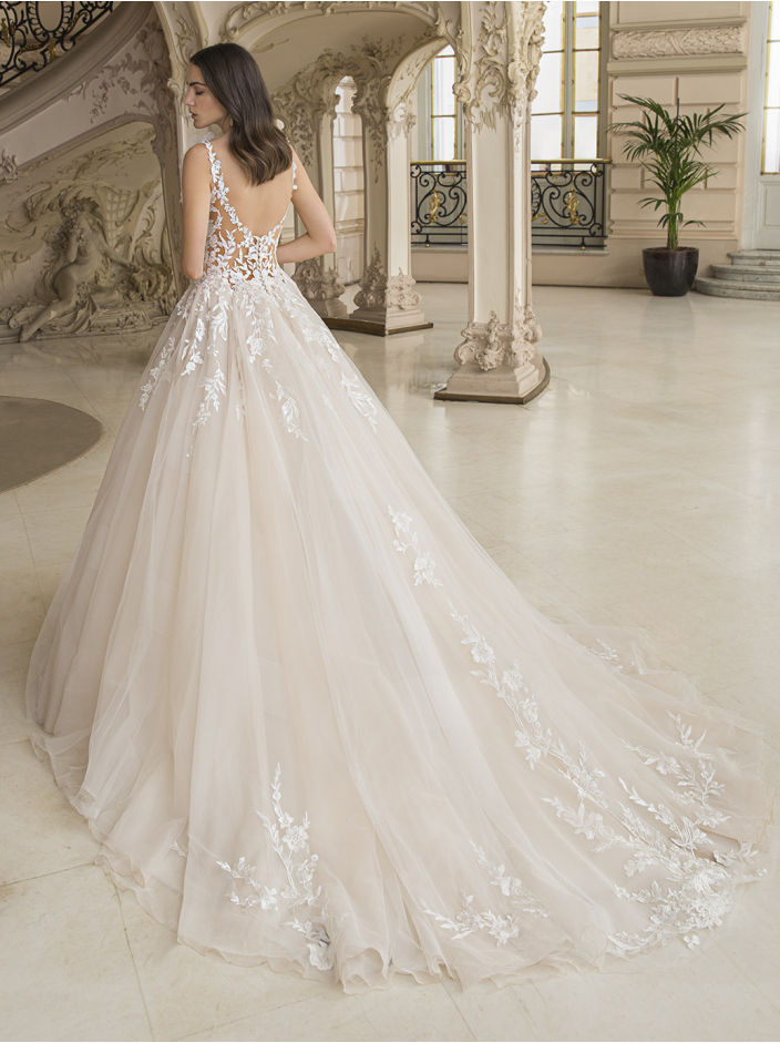 Papillon from Elysee features a sexy plunging neckline with exquisite and unique 3D butterflies and 3D flowers on a sparkling floral lace bodice with body-contouring side cut-outs. The floral and botanical lace from the bodice trickles down to the soft A-line tulle skirt for a super-romantic wedding day look.